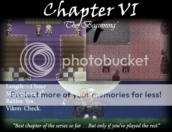 Chapter VI is still going well, although I believe it's being cut short from its original plan in terms of the amount of material covered. Still should be 30-45 minutes, though, and I will try to get it out around Christmas. Although, just a disclaimer; this chapter may not have much game-play again - though the importance of its plot in the whole story should make-up for it.