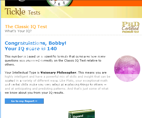 Taking about 5 or so minutes to take one of the plethora of Tickle's IQ tests, I scored a 140.
