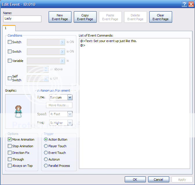 Set you event up like how you see in the image below (after messing with it you only need one event and a demo is not needed. I did test it and it works. Type what ever you want the Inn lady to say in the SHOW TEXt/MESSAGE box.