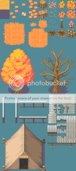 <3 the re-color just maybe a little less bright orange and its a perfect fall look! also we wont need to edit all because as you see now its a FALL tileset, maybe jsut edit the ones with theme's like the castle was red now mine is a green castle, but changing seasons is also a great idea =D
