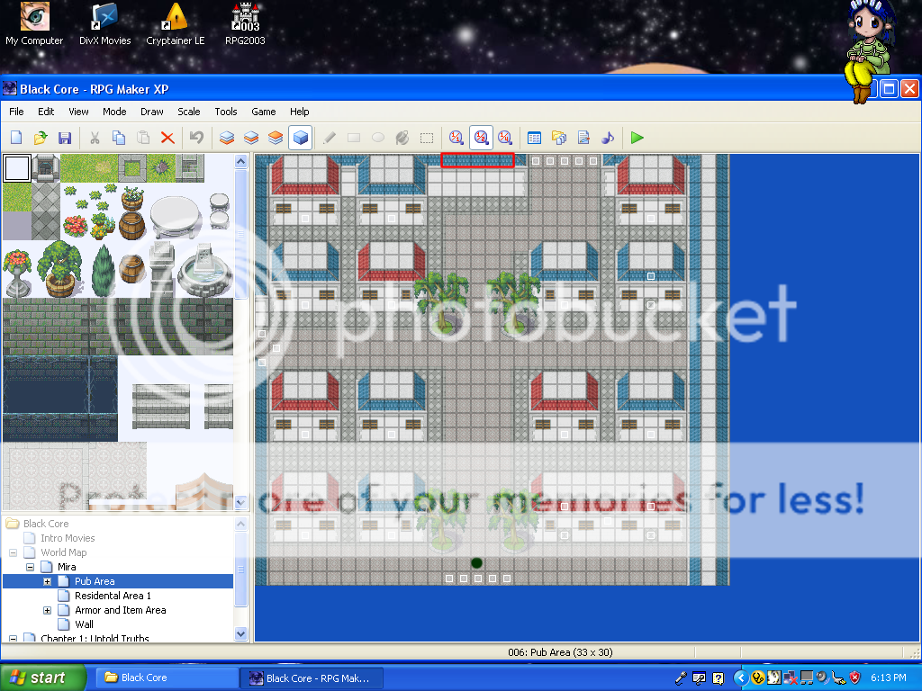 the red box up the top is where I used to have events (I figured out away around this problem when I was on the bus home, the image was taken after I had fixed the problem but I forgot to change it back) these would take the hero to Armor and Item area above events that would take the hero back to Pub Area