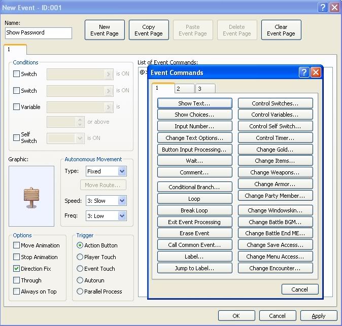 In this first actual step for our special chest, let's make a new event. This event will show the number for the password! Okay, choose a graphic (I used a bulletin and if you are going to use a bulletin, remember to tick "Direction Fix" in the event options so it doesn't turn into something different) and then double-click the eventing box to make our first event line.