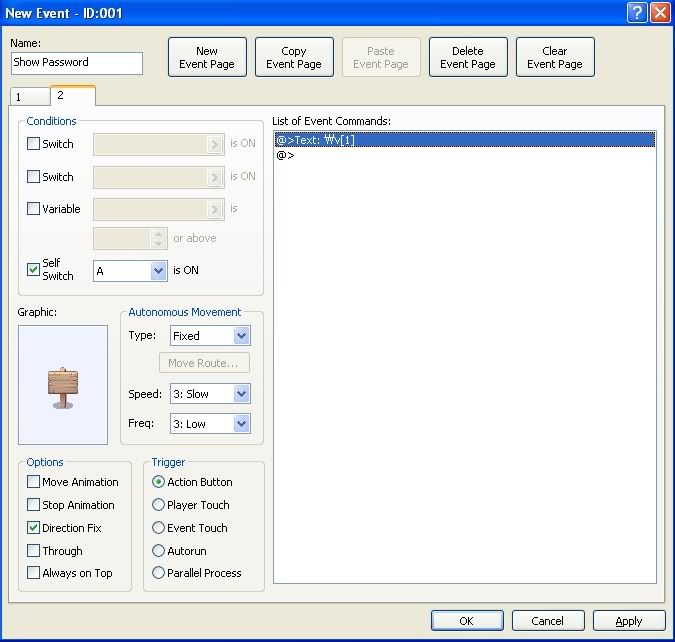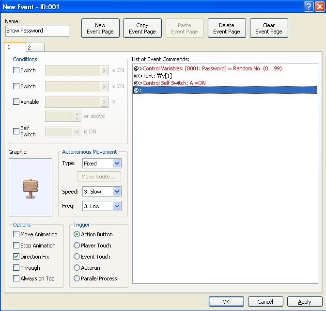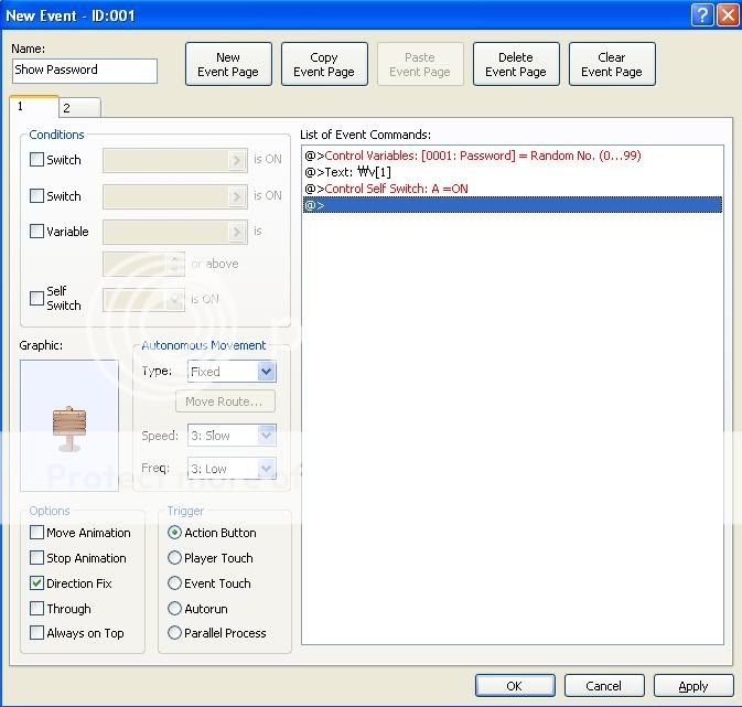 Here we will put everything in our first event. For our first portion, choose the option "Set Variables" or whatever it is called (I'm using legal so I don't know PK words). Choose a variable (use the first one) and name it something like "Password." Always make sure to use specific names. For our operation, we'll leave it at "Set." For our operation, make it do "Random" and in the first box type 0 and in the second box type 99. What this will do is it will choose a random number from 0 to 99 and assign it to the variable. Next, choose "Message" or "Show Text" and in the box type "\v[1]" (the \ is a backslash if some people have weird settings). This will display the data stored in variable 1. To change what variable to show, change the value in the brackets (the []). Our final step for this page is to turn on the Self-Switch A. After doing so, make a new page with the same things except only the "\v[1]" in the events and a pre-condition of self-switch A. That will make it so that the password does not keep on changing.