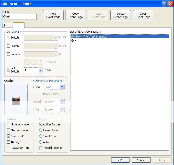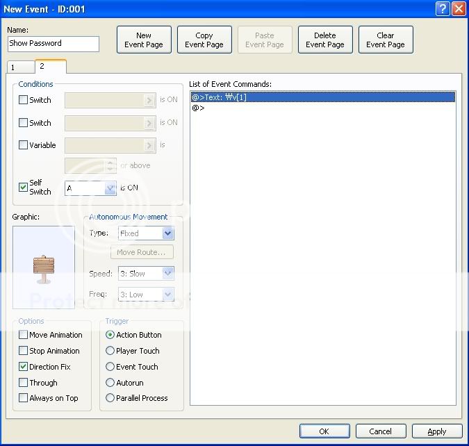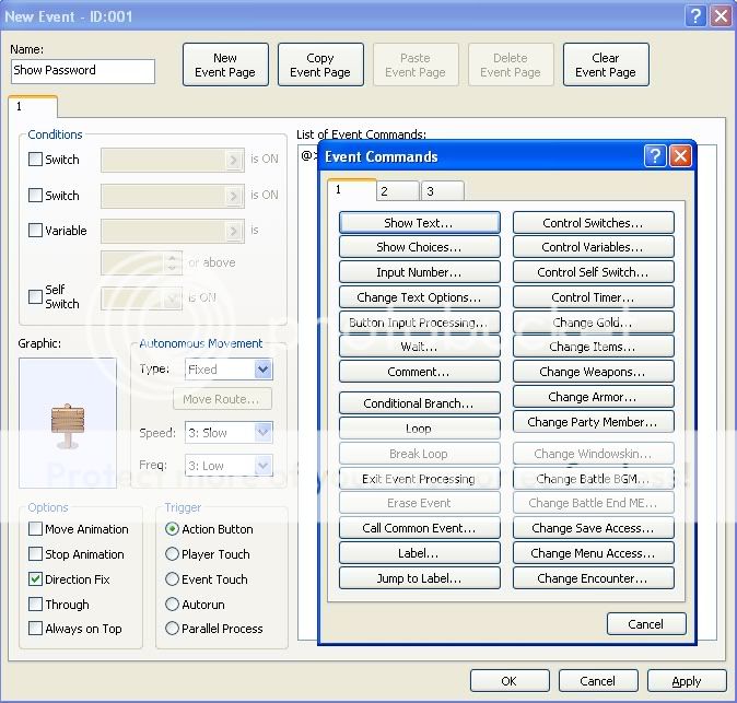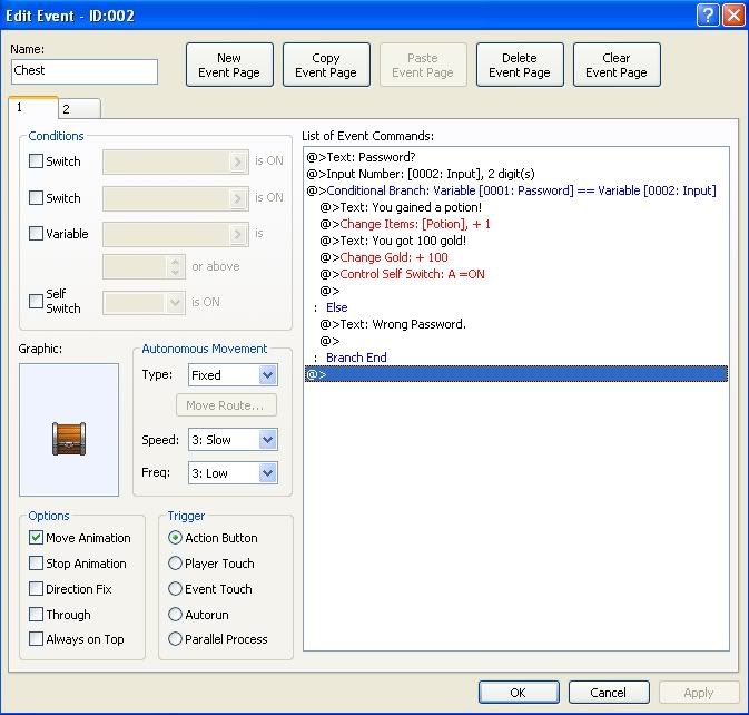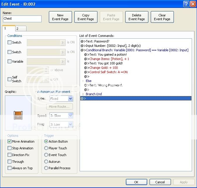 This will make the chest. Basically make an event with a chest graphic and keep it on "Direction Fix" as well. The first event line will be a message that says "Password?" Then make a second event line that is "Input Number" (first page, first column, third option from the top) and set it to variable 2 and name it something like "Input." Choose the 2 digit option. In our third event line, make a conditional branch and set it to "Variable" in the first page. Choose if "Password" is Equal (nothing else) to "Input" (the two variables are interchangeable). In the "Else" area, just put a message display that says something like "Wrong Password." In the other area, make it do some regular chest stuff like give items and money, making sure that you give a message showing what you gave. At the end of those event lines, turn on the Self-Switch A. Make a new page and set the graphic to an open chest and with "Direction Fix" ticked. Put a "Self-Switch A" precondition. For the events, just write something like "The chest is empty."