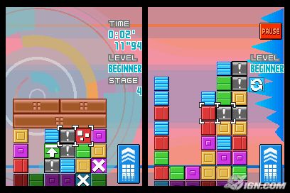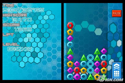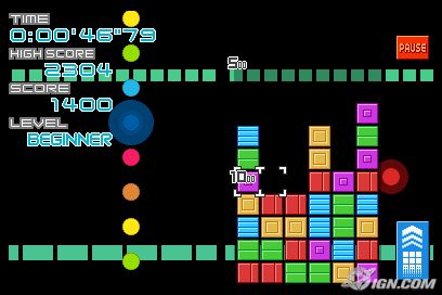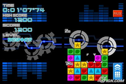 The main aim of Planet Puzzle League is to line up three or more blocks of the same color and shape to score points. Meanwhile a line of blocks will continue to stack up from the bottom of the screen. If the blocks reach the top of the screen, it's game over. The catch is that you can only slide blocks left or right with either the stylus (which is much more intuitive and simple to use) or using the traditional button controls. Create chains by setting up the blocks to clear and then have another line blocks fall on top and clear as well. Chains and combos are the greatest means to score big points.