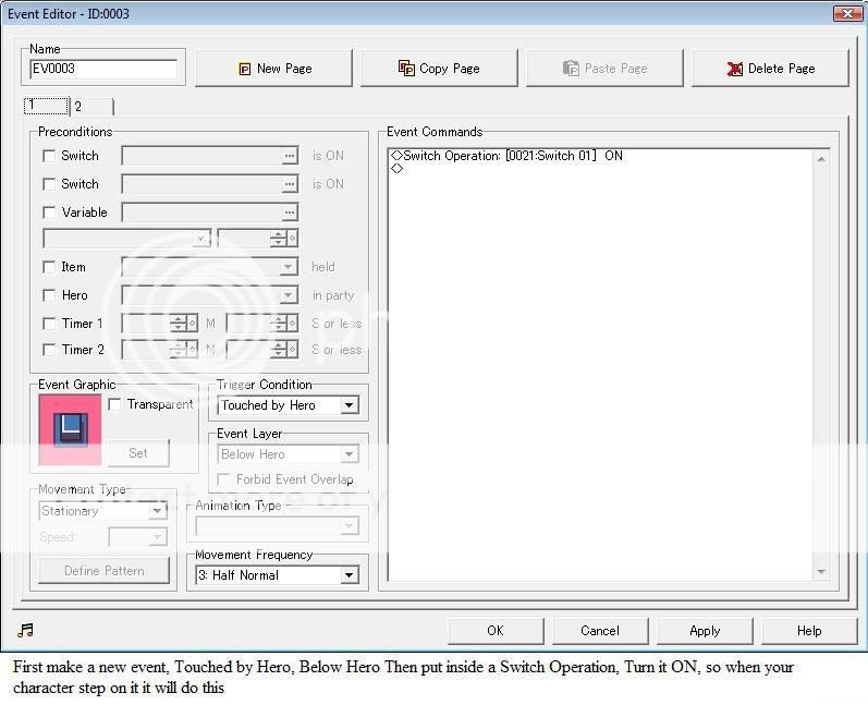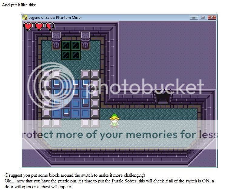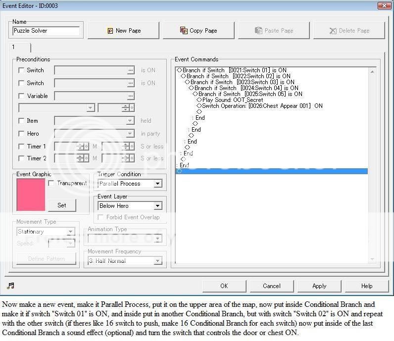 oh forgot, for the ones that will be ON, you must put on the teleport event to the map where the puzzle is a Switch Operation and turn on the ones that you want (like Switch02, Switch08, Switch09, Switch12)...and for the second picture of the tutorial, put Touched by Hero instead of Action Key.
