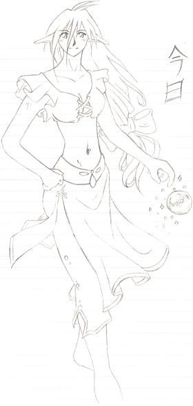 I have difficulty drawing female characters, especially older ones... (Kyou is about 20) and somehow all my male characters look like women...  But besides all that, 'tis just concept art, and was drawn during AP Lit... difficult to concentrate...