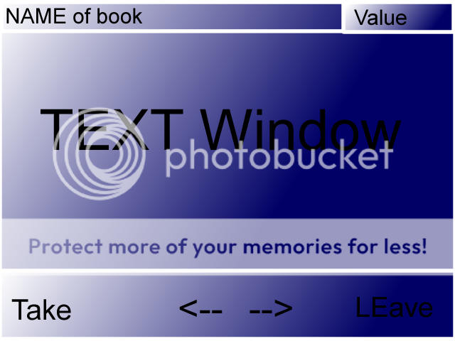 The second frame will lie underneath the text window, and will be (640 x 96). THis is the options bar. In the center, I want the options --> (forward page) and <-- (back page) side by side. on the far left is the option take, while on the far right is the option leave.