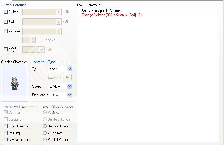 Now, make another "Auto Start", "Common Event", named Max Stats, with its turn on switch being Max Stats. Have its first command being to turn the "Switch Cheat System" off. Then have a message saying, Password Correct! Max Stats aqquired! Then have it change;