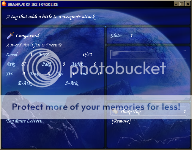 • A weapon system where the weapon itself will level.  The higher the level, the more customizable the weapon is with the use of 'Tags'.