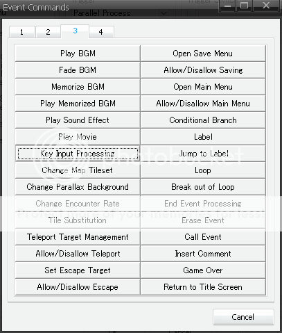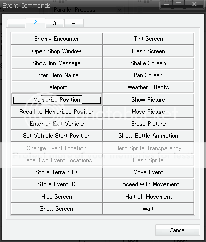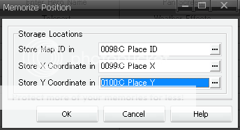 Now we have the graphical transition in place, we need to make it so when you goto the menu, it teleports you back to where you came from, for this, we will use "Memorize Position" and three switches. Name three Switches "C Place ID", "C Place X" and "C Place Y", these will be used to memorize the character position and allow them to go back to there original location. After all this is done, find the "Memorize Position" event.....