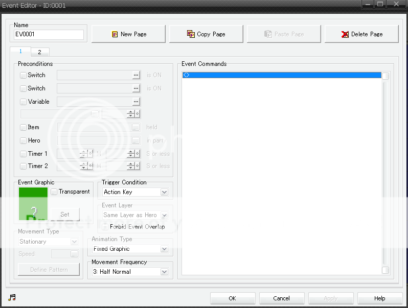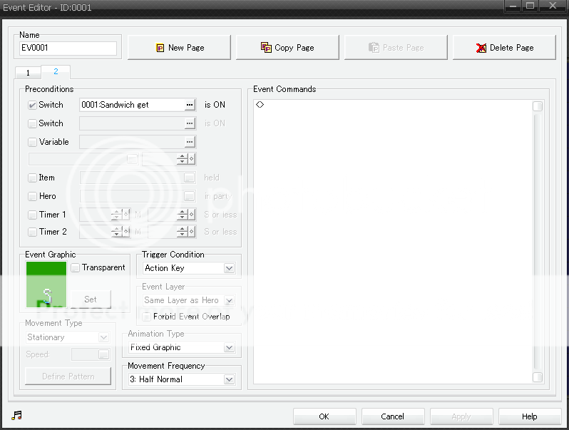 Now, with the "?" event you just created, make a new page, this page will be used to show the letters of the recipe, example; when the recipe for a sandwich is found, it will pull a switch, changing the "?" to "Sandwich".