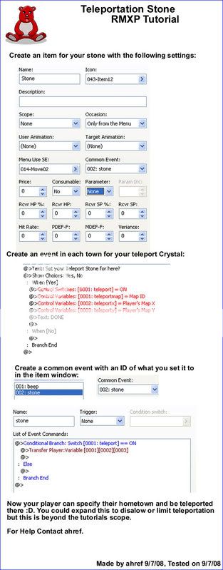 Ok, i need help with this. I want there to be an item called a teleportation crystal, when you use it it teleports you to a city you set it to, at the expense of all of youre mana. Each city would have a giant crystal, that you would go up to to set youre smaller crystal to that town. The smaller crystal can only be set to one town. How would i make it so that you can go up to the large crystal, and set the crystal item to that town. then, if i was out in a field or somthing, using the crystal would bring me back to whatever town i set it to. But, how would i set it. and also, once set, how would it be reset, and set again, when i go to a different town and want to set it there? It should be able to be done with events, so... anyone?