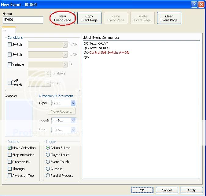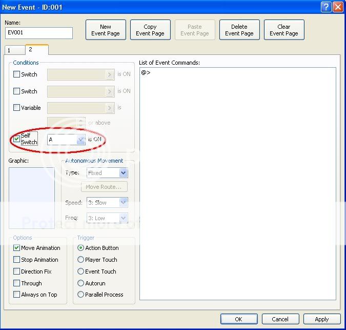 This will create a second, blank page. As long as it's blank and not set to Autorun, it won't do anything. All you have to do now is to set the conditions on that page so that it won't run unless the self-switch you assigned is on.