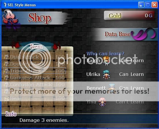 This demo contains the original MOG Menu & Status Scenes, with the VX versions of the ITEM, SKILL, EQUIP, and SHOP XP scripts. Also contained is an adjustment to the Skill Shop by Nechigawara Sanzenin to fit the SEL style.