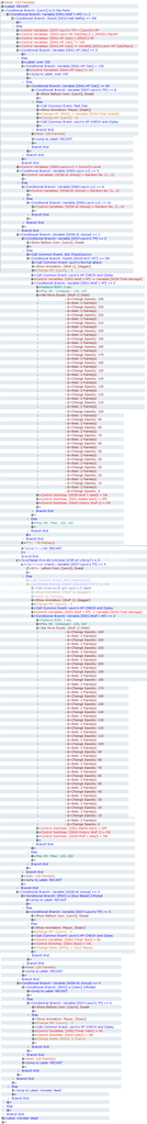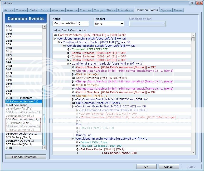 Been working hard, and this is the first battle system that I've manage to almost complete that is completely evented. Takes about 10mins to replicate a monster, and about 20mins to make a new monster. I have to copy paste each common event for each monster, so, for Levin's AI I would be copying his AI common event, pasting it and then going through and changing the animation targets and other variables. This is probably the main reason as to why this game is coming along slowly =x
