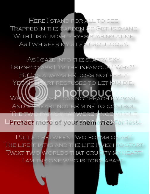 Something I whipped up quickly for a school project. Took the themes of one of my stronger game ideas and made it into a "visual poem", since few people ever seem to take the time read things anymore. It's only after turning it in that I realized there was a typo in there, but I don't think it'll dock me any points.