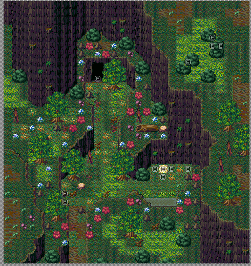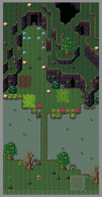 Map here is to basically say what is what (the water by the entrance is a full heal spring,the dark green grass inflicts Poison status to the party, the red plants inflict something I haven't decided on yet, the brambles inflict something, and the blue flowers inflict something). This is the very first area of the Valley of Corpses dungeon (I know! I'm working on a beta5 dungeon! GASP!) and well...it's supposed to be a valley. I wanted to use a different tileset than the Youkai Mountain tileset (which is also shared by the Forest of Magic I do believe as well as Eastern Forest), so I looked around and found this one which feels more swamp-like but...I think it works well! And of course, there's going to be caves. There's ALWAYS caves in this freaking game ehehe...