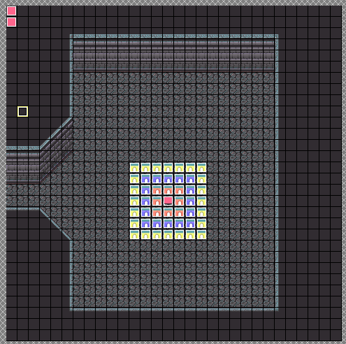 There are 3 switches: Yellow, Blue, and Red. The colored blocks you see in the first images are all raised or lowered depending on the switch pressed. What I need help is well...setting up the puzzle really! I'm terrible with making puzzles, and this is the ONLY puzzle in the entire dungeon. In fact, the dungeon itself is extremely short. So if anyone can help with these puzzles, that'd be fantastic. x_x;;