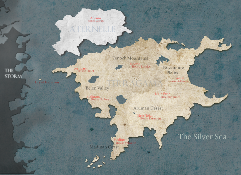 Here you will see the major regions of the continent-- the Belen Valley, Aruman Desert, Nevenmire Plains (also known as the Eastern Embrace), and the northernmost subcontinent of Aternelle. Also of note are the eight Great Houses as well as the kingdoms they rule over. Last but not least, is the impenetrable Storm, which dominates the western sea.