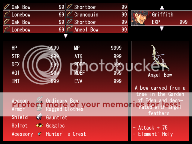 The status menu and the equipment menu are the same. The box containing the weapons would contain whatever you are able to equip to a slot and wold not appear unless you are equipping something. The box on the right would work as the help/info box and contains a picture of the item you're equipping. It got erased by my computer, but the character's level would be displayed as L.## Next to their name (With the numbers aligned with experience)[/spoiler]