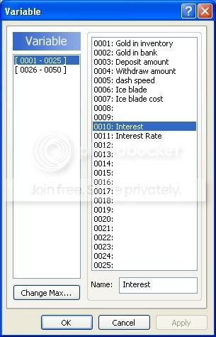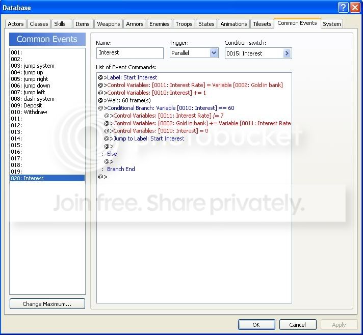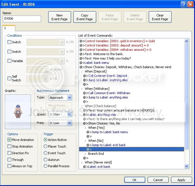 I made a Tut for a Bank a while ago, it used Labels. Mine really went into alot of stuff. But I'm going to redo the Tut soon and repost it. But the point I was going to make is that you could actually do everything in one Common Event. I myself did things a bit differently. I made a bank teller. This was for the player to make an account and also get a Banking Card. I then made an ATM event one that I could Copy and Paste it any where. Also, I ran into this problem when I frist wrote my Tut, there is no need for a Bank if the player can have just about unlimted Gold (the limit is actually 9999999). But that was my second point. But it would be nice to have some reason to use a Bank. The way your Bank is set up (mine as well) you could use the Bank to store other things other than Gold. You would have to add somethings (Text, Variables, etc). I also wrote a Gold Limit Tutorial (to limit your Gold using an Event. Mainly it was to cut the Gold limit for the player down to what ever I wanted. If i ever wanted to higher the limit I could any time. Say the player gets a bigger wallet? It's based off of Zelda), but because I'm rewritting my Bank Tutorial, I'm just going to included it. Other than that it's a wonderful use of everything you used. It works well and is very striped down. Good job Wizard576. My hat is tiped to you. *tips hat*