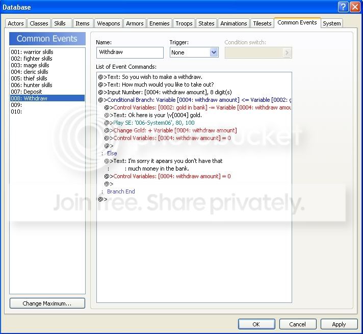 Ok now after that. You will need to make two common events. One for deposits and one for withdraws. The deposit one should look like this. One line has been added and is circled in black.
