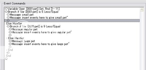 Set a variable to random between 1 and 11 (using your given numbers) and you can set conditional branches to determine what numbers give what pet.  In that example, I've given 1~5 for a small, 6~9 for a regular and 10 and 11 for a large pet.