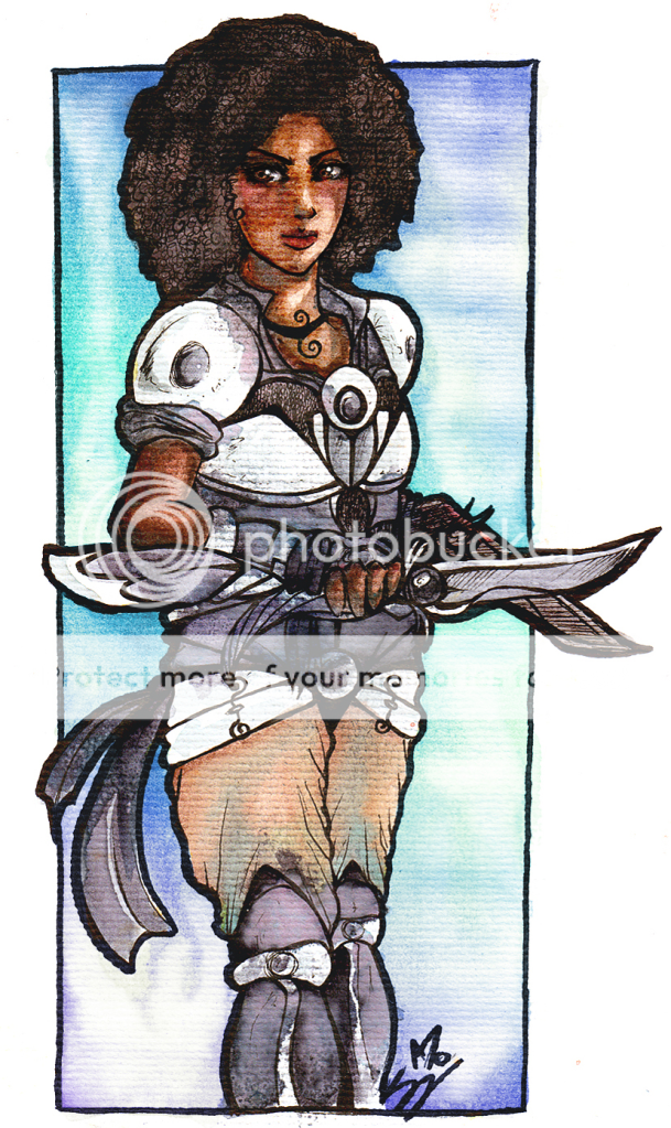 Neariah before the Avengers, was always considered a gullible and crazy person. She is 21 and dark-skinned, and she was raised in religion, but discovered things that she never questioned before. She researched to find out of conspiracies and the Avengers. She joined, and was named Soul Guardian Captain in months and handpicked her members. She is a strong willed and courageous person. She thinks everything should be done justly, or the cycle of unjust will continue. She has a black and curly afro. She wears a long sleeve white shirt with a black suit of armor covering, tight leggings with armor covering her calves, and black and white sneakers. She wields double daggers called "Shogun's Savory", which can be combined to make a long blade.[/spoiler]