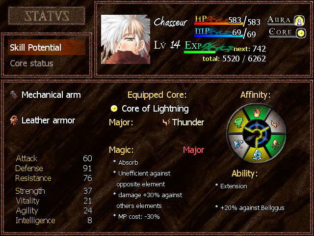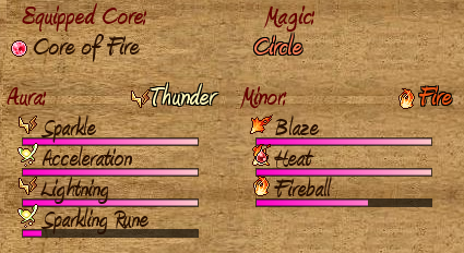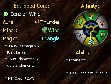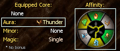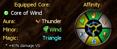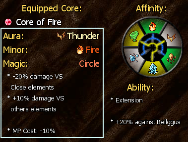 A Core is a unique elemental orb which can be equipped. An equipped Core gives the character a Minor, which is a secondary Aura, and opens a panel of learnable spells as well. The Minor doesn't modify the character elemental weaknesses though.