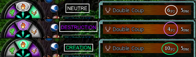 The terrain is under the influence of elements. The player can make a good use of these influences. At each turn, each element gets an associated alignment: Neutral (white), Creation (green) or Destruction (purple).