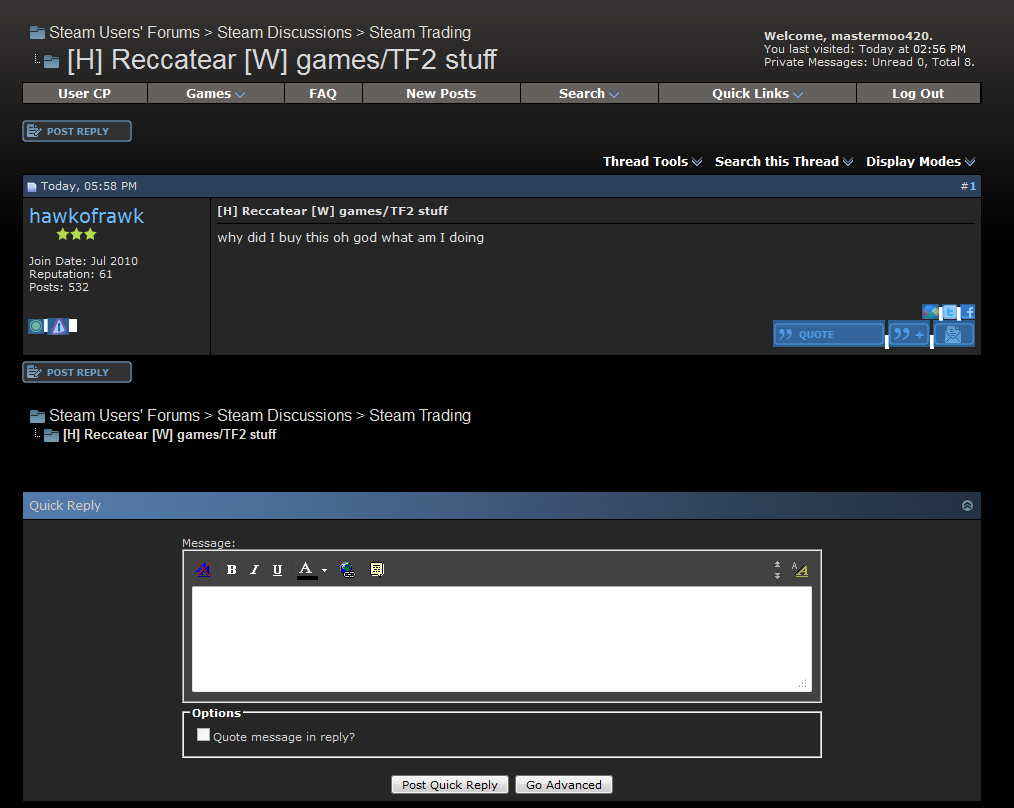 Okay, so I've been spending the past hour or so watching videogame streams and also looking through the Steam Trading forums trying to trade my crap for other people's crap that I actually want. And this guy just takes the cake: