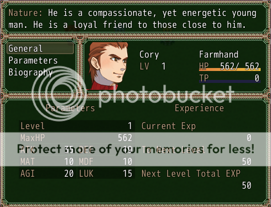 • Main hero "phoenix"? When the main hero dies, he will be revived with 1hp after the battle (this might actually be approved, not sure. Helps prevent "game over" bugs if a player leaves the party by scene while Cory is dead, etc.)