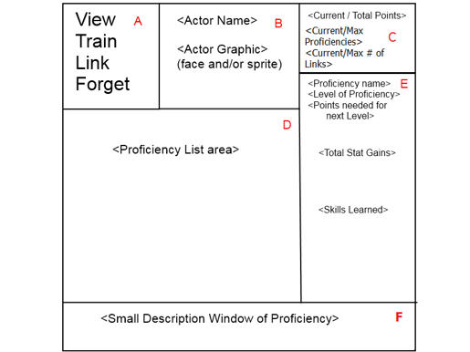 • A new scene used for training that shows the actor's character graphic and total points, that actor's proficiencies and level (as either just a number (i.e.  level 1/10) or a number and bar graphic) as well as various information on the selected proficiency (A small description, the Stat(s)/skill(s)/trait(s) gained on next level, as well as points needed to train to next level.), and a confirmation box asking if you are sure you'd like to spend the points to level or link the proficiency(s).