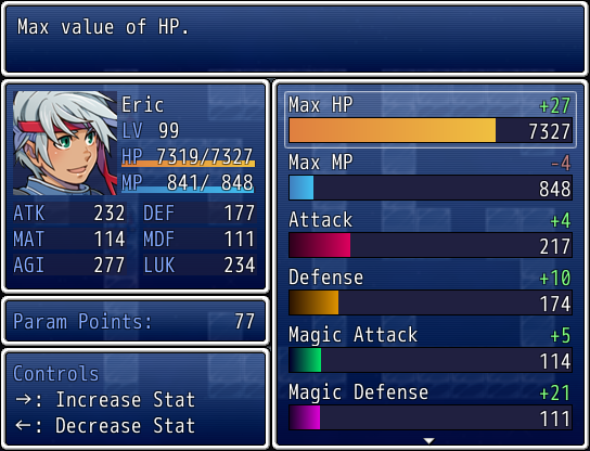 Dude, thank you sooooo much for this script! I've been messing around for days trying to sort out a way to increase stats via a custom shop but results were far too ineligant to be  happy with and while I'd still like a "mentor" character to be involved in the distribution process this menu window set up does exactly what I want in a perfectly simple form and for the level of customization made available is unbelievably easy to use, you ROCK man!