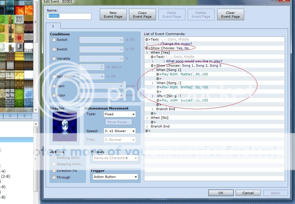 You should look for a script called simple mouse script system (if i find back the link i'll post it). It allows you make an event start by directly clicking on it. So we have the "boombox". To make it run without a script, you can try to use a variable. Depending on the variable value the event will start a different song (by the way with song you mean bgm??).