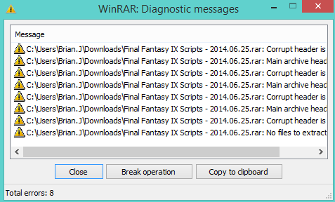 I have the same problem, except I get 11 errors as opposed to your 8. I've tried repairing the RAR file but to no avail. Google doesn't seem to be helping either.