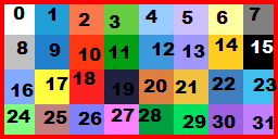 If you use the graphic from the help file as a guide, then 0 is the top left most colour and it moves left to right, top to bottom: