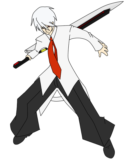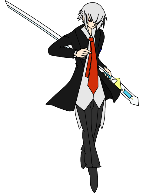 Due to the game being an alternate world of BlazBlue, he is the split image of Jin Kisaragi although not exactly the same. Besides that, he is a good-looking and slender young man with short, emoish white hair and red eyes. He wears the regular outfit for the Junior Student of Six Souls High School while this attire changes slightly adding a jacket with a blue armband saying "Public Relations Division". He also has a pin on the jacket signifying his status as the Hero of Six Souls.