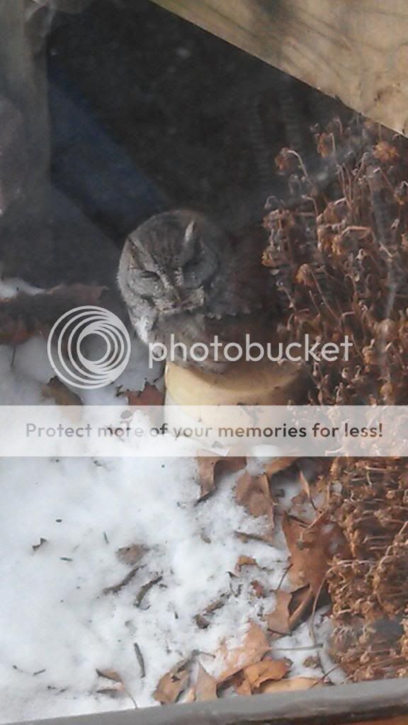 This little guy is apparently a young screech owl who has taken up shelter in Tigger's old hideaway under the porch for a bit due to all the snow. My mom says she's spotted the little fella around quite a bit since first discovering him under the porch, when she accidentally startled him away to a little grove of trees in the middle of the lawn. My mother has had a fixation with owls for as long as I can remember, owning all sorts of little owl ornaments and trinkets around the house. Owls are as special to her as foxes are to me. So when she found that this little screech owl had taken residence in Tigger's old shelter and was hanging around just as Tigger did to hunt down the shrews populating the area, it felt to her a bit like Tigger had come back in spirit for a while to bring a little bit of warmth in the midst of the cold winter storms.