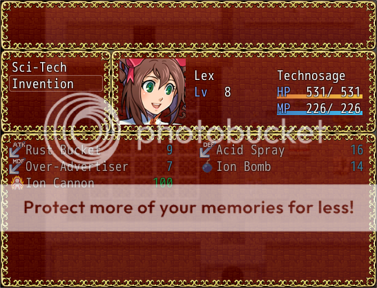 Lex is by far one of the fastest characters in the game; unless specced otherwise, she will ALWAYS act first in combat. In many cases, that's a really good thing; because she can buff the party and debilitate the enemy using her special "Sci-Tech" magic. She is also the only character in the game who knows spells that can allow you to act multiple times in a turn, provided you can keep her from being silenced. When not using magic, she can use her special "Inventions" to devastate the enemy and really charge her up for crippling moves such as her signature Ion Cannon or a use of the Singularity. Protect her, and she'll protect you.