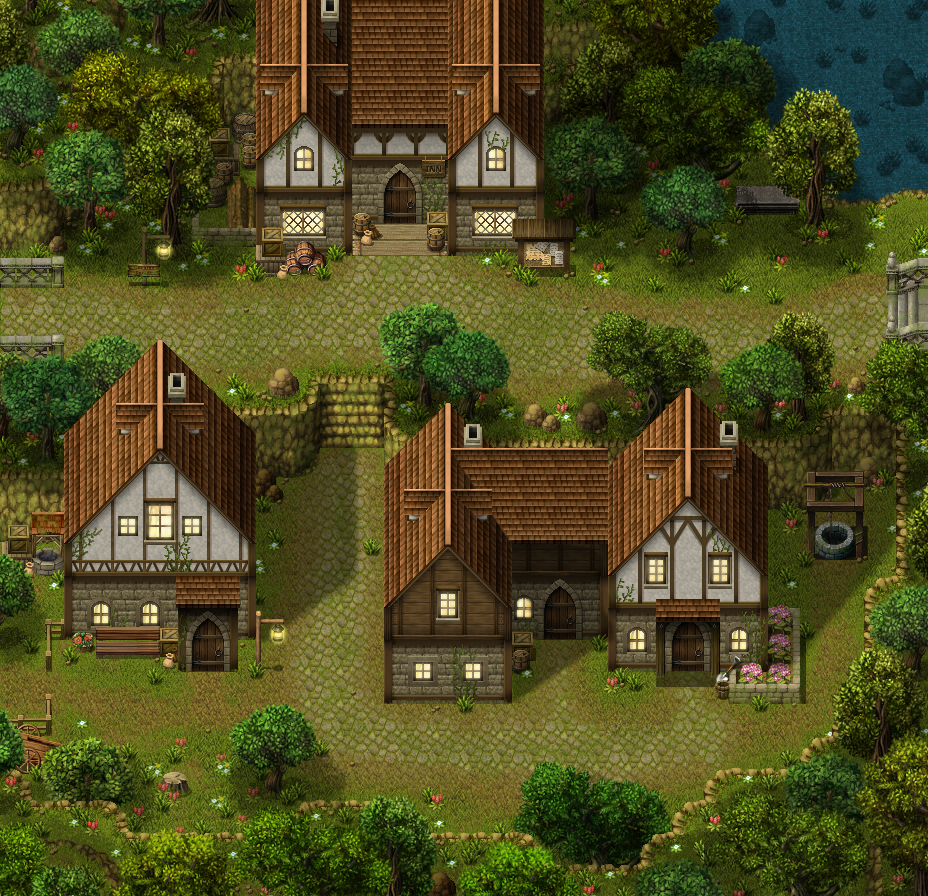 One (out of two) of the town's exterior maps is now complete! ;o This is the village area, where the inn and houses will reside. The other map will be the market area.