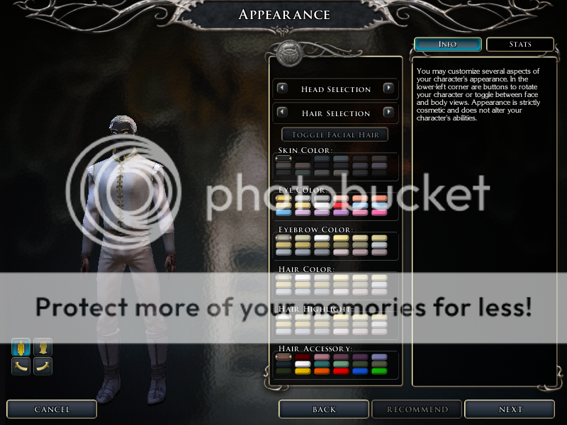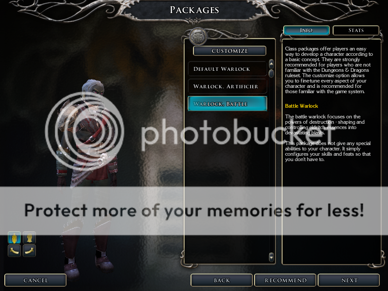 Selecting a Package for you class determines the way your skill and ability points will be used as you level up.  As a Warlock, my choices here were between one whose focus is crafting magical items or whose central interest is blowing stuff up.  Really, is there any difficulty deciding between that?  Anyway, some of the classes get some interesting packages.  Rangers, for example, can decide to specialize with the use of a bow, or to be sided with nature, or to be righteous wardens of their land.  Rogues could be cunning lurkers of the shadows, merciless cutthroats, or smooth-talking swashbucklers.  Pick what sounds awesomest to you, because this affects how their skills are distributed.  In the examples I named, the bow-using Ranger will be given archery-related Feats in his early levels, the sneaky Rogue will gain bonuses to Move Silently and Hide skills, and the swashbuckling Rogue will prioritize conversational skills such as Bluff, Lie, and Diplomacy.  At any time during character creation, you can check the "Stats" tab at the top right corner to view how your character is coming along so far.