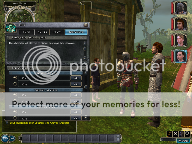 A new addition to NWN2 is the ability to directly control your companions' behavior.  If you have a rogue with you, you'll definitely want to toggle their behavior to ensure that they'll disarm any traps or locked objects you may come across.  BUT, if you play as a rogue yourself, you'll probably want to disable those behaviors in your companions, so you can do it yourself.  Unless you're some kind of lazy rogue who makes everyone else do everything for you.  Actually, that doesn't sound so bad, after all.  But anyway, the option is there.  Here's another good example of how freakin' ugly all of the character portraits are.  I mean, look at those.  Ew.