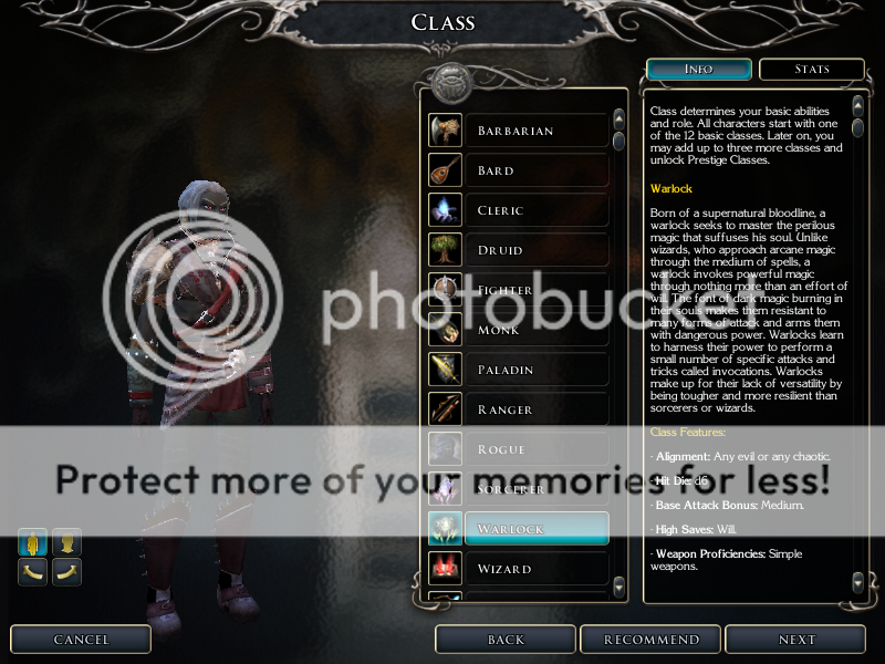 Okay, now that I've got an appearance down for him, it's time to select a class.  This is THE most important part of character creation.  You will probably want to review the descriptions of each of the classes in the instruction manual before waiting until this point.  A cool part about this portion of character creation is that it will show you what beginning costume your charcter will start out with, in accordance to your class.  Even though you can't select any of the Prestige Classes right off the bat, you can still look at their costumes.  The Duelist gets an awesome hat!!  For my character, I have selected the newly-added class, the Warlock, a spellcaster who derives his power through innate ability and "dark magic."  Befitting of a drow, no?