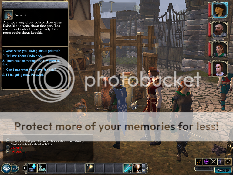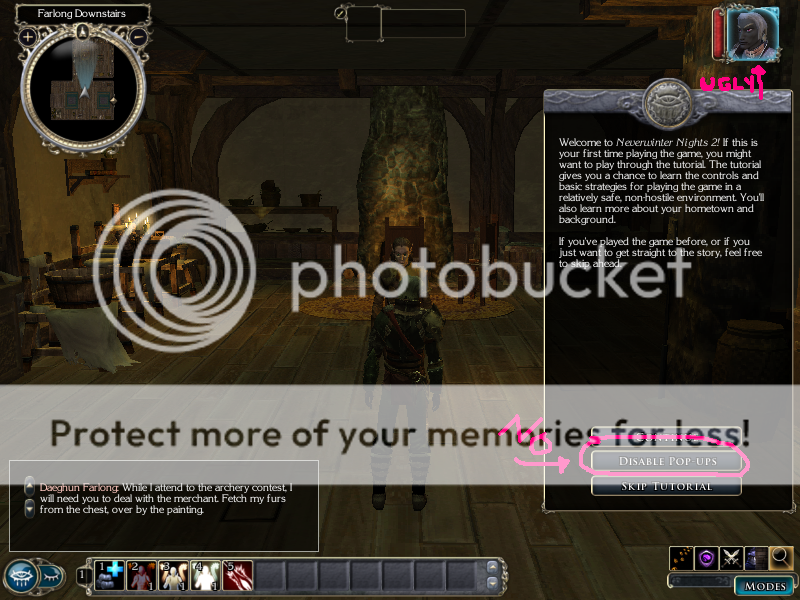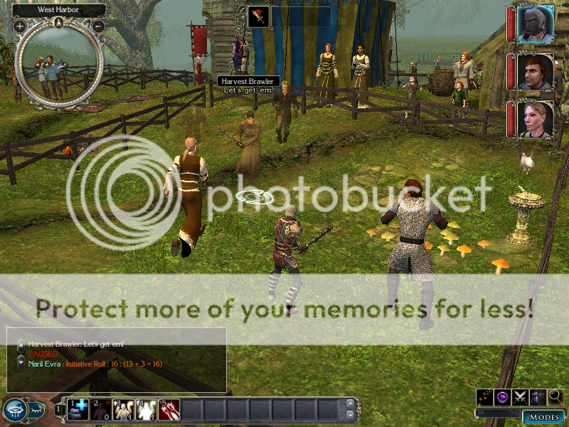 The setting of the game begins with a convenient Harvest Festival, which we all know is just video game lingo for "Tutorial."  I made the mistake of thinking that gameplay would mirror the first NWN, so I disabled the tutorial pop-ups, which left me to fend for myself against the cruelty of new terms such as "quickcast bar," which did not exist in the previous game.  New players and veterans alike definitely want to leave the pop-ups on.  Oh, and this is also the first time you will see your character's portrait displayed at the top right corner of the screen.  You will soon discover that, no matter how awesome your character may be, their portrait will display them in the most unappealing way possible.