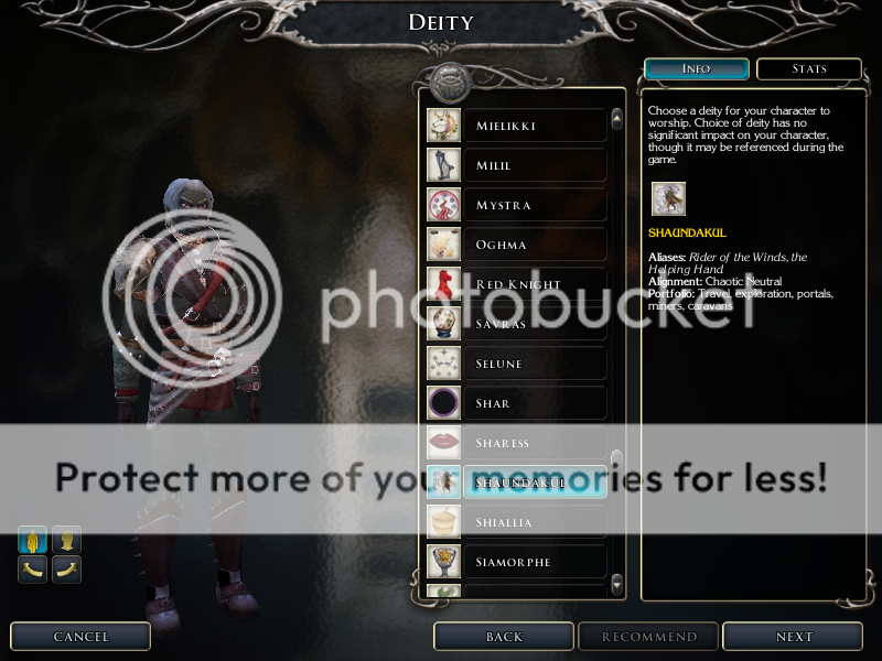 In Forgotten Realms, a deity acts more as a name for the way of life that a character leads, rather than a concrete religion.  The concept of deities was best described in book 3 of the Legend of Drizzt series, wherein Drizzt is highly reluctant to side himself with a deity until a ranger explains to him what it truly means to follow the ways of a deity.  The name of a deity is the collective name of the beliefs and way of life that you (or your character) lead.  Your list of options for this part can be pretty overwhelming, but sometimes the list is shorter (the available deities depend upon your race, class, and alignment, assuring that you could not select a deity that negates the way of life that you've chosen up to this point).  Unlike the first NWN, NWN2 possesses a complete list of every deity in the Forgotten Realms universe.  I've decided that my character is going to be somewhat of a wanderer, so I've selected Shaundakul.  The easiest way for one to select a deity from this list is to scroll through each of them, looking for items listen in the "portfolio" that coincide with what you believe is most important in your character's life.  If you were wondering, Drizzt eventually settled on the righteous and merciful goddess, Mielikki, who you can see is also available on my list. :3