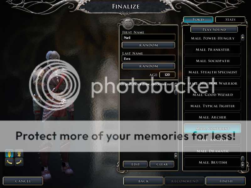 Finalizing the character can be the most engaging aspect of character creation.  Here, you choose your character's first and last name, age, background, and voice set.  The handy-dandy random name generator is useful if you haven't put any thought into a name until this point, and the randomized names the game selects from are dependent upon your race.  Dark elves live to be about 700, so 120 years old isn't quite as ancient as it sounds.  There is also an area where you can type in any details you might want to share about your character that haven't been covered already.  You could leave it blank or just type nonsense, but it's this description that is visible when you play with this character online and another player is examining your profile.  The voice set you choose determines the way your character sounds when he talks, which includes commands, battle cries, emotes, etc.  NWN2 included all of the voice selections from the previous game, and has added several more.  Some are awesome, others are ridiculous, and others are just really, really funny.  Make sure you're comfortable with your selection here, because you will constantly be reminded of your choice throughout the game.  A character I made in the first NWN would shout "Blood makes the grass grow!" at the beginning of every single battle, which was funny at first but eventually got really annoying.