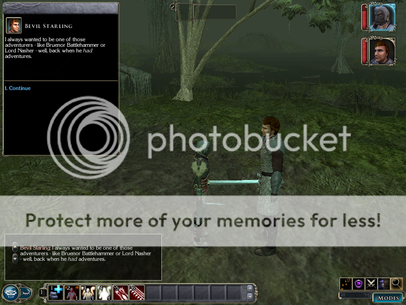 One of the options you are presented with by right-clicking on any one of your companions is to initiate friendly conversation.  This is how your character builds relationships with the companions, which determines how they react to your decisions throughout the game.  This was a particularly interesting conversation, because it is a direct reference to thems kooky Legend of Drizzt books that I read.  Bruenor Battlehammer is one of Drizzt's friends and an important main character in the books.  I'm just all kinds of geek.