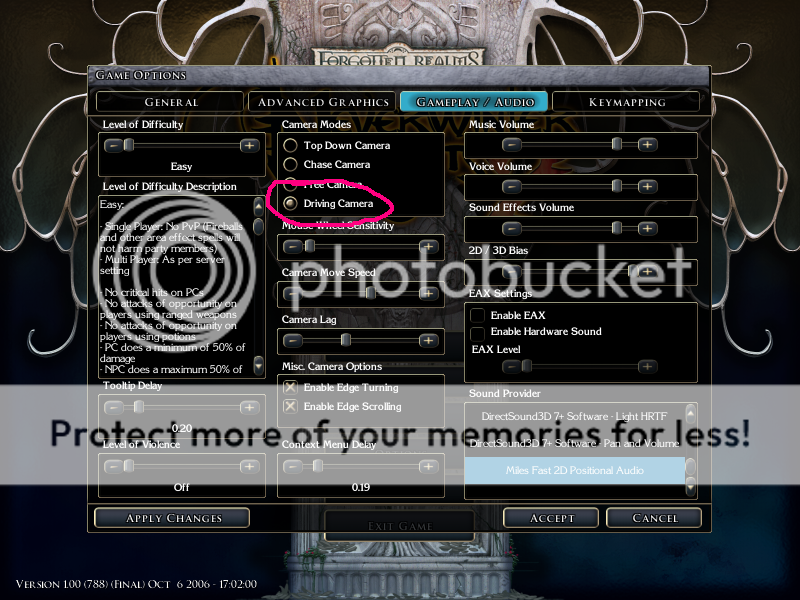 First of all, the most natural-feeling camera mode is "Driving Camera Mode."  The others are, in my opinion, very awkward.  I point this out to you because I played through a good chunk of the first NWN without toggling the camera mode, and the default camera angles made gameplay measureably less appealing.  Other things to fiddle with in the Options screen: Your computer's video, shadow and texture capabilities.  NWN2 runs with somewhat of a lag on my computer, even with everything set on the lowest quality.  That's a little disappointing, but it is bearable.